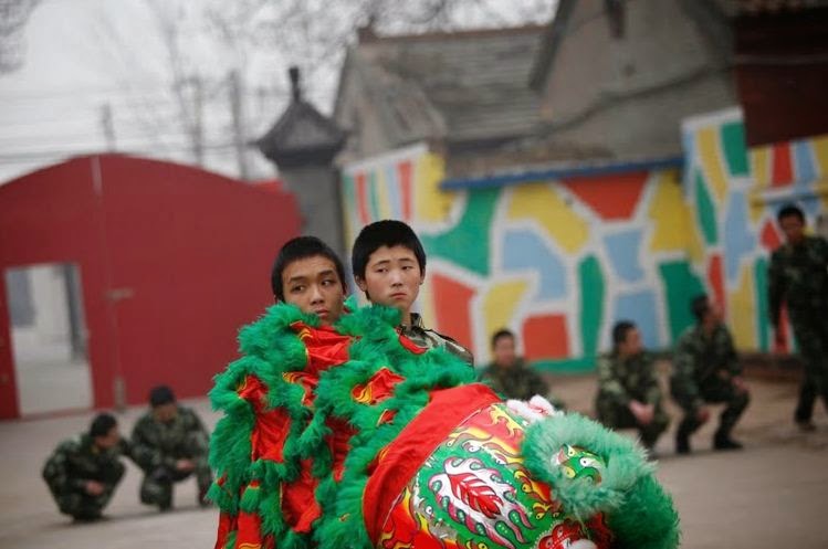 In the image above, a teacher and an ex-military instructor escort a girl to the Qide Education Centre, a boot-camp in Beijing.